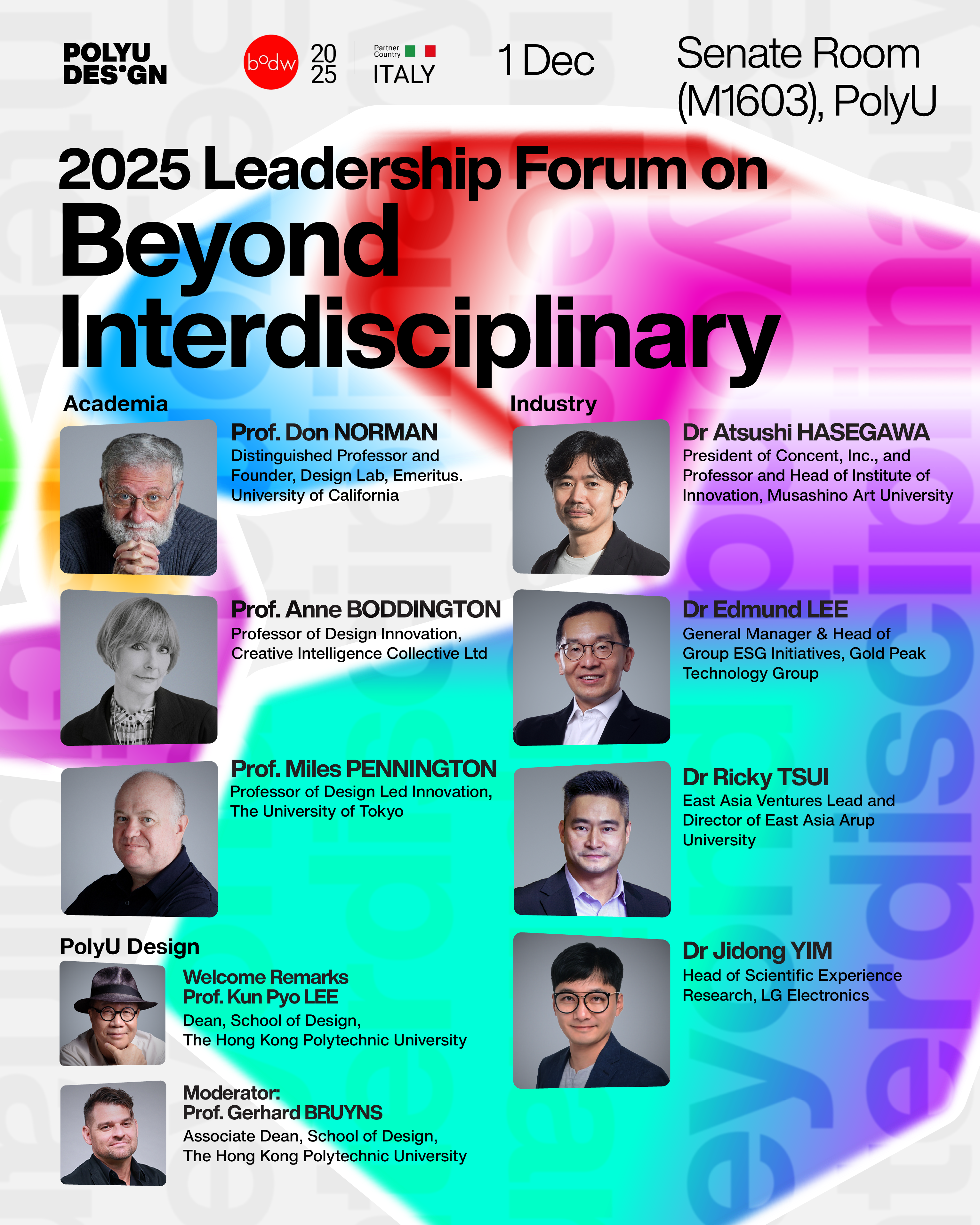 The 2025 Leadership Forum on Beyond Interdisciplinarity is a concurrent event within the programme of Business of Design Week (BODW), a flagship event organised annually by the Hong Kong Design Centre and The Hong Kong Polytechnic University School of Design (PolyU Design). This year, the Leadership Forum is scheduled for 1 December 2025 as a hybrid event. Traditionally, the Forum brings together industry professionals and academic leaders to share their perspectives and insights.